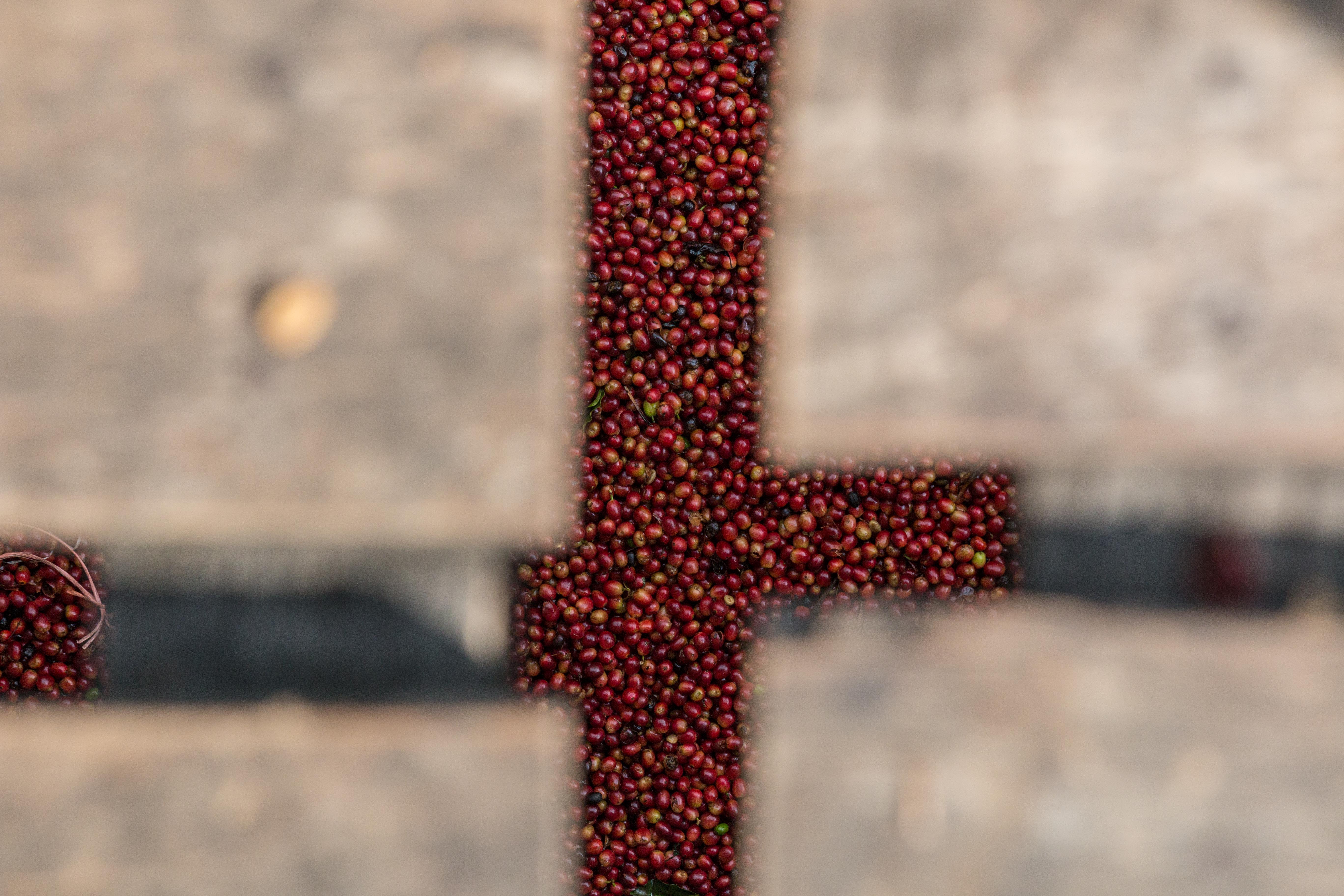 Fresh harvested coffee cherries beneath the floor