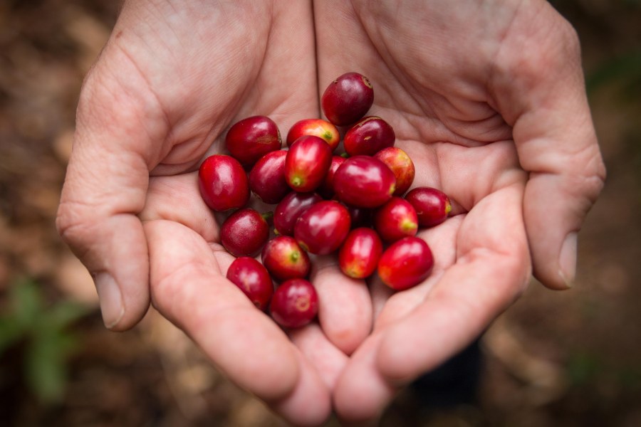 Fresh picked coffee cherries in Rachel Peterson’s Hand 1